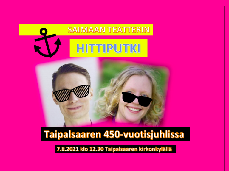 Saimaan Teatterin hittiputki2021Saimaan Teatteri on mukana juhlistamassa 450-vuotiasta Taipalsaarta! Henri Lyysaari ja Jonnakaisa Risto esittävät vuosien varrella Saimaan Teatterin esityksissä kuultuja lauluja. Henri Lyysaari, Jonnakaisa Risto kuva JONNAKAISA RISTO
